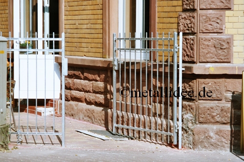 Eine verz. Tür passend zu 16 Meter Geländer # 141 mit Hespeneisen und Rahmenstäbe Vollmaterial 35 mm angespitzt. Maße 1400 x 1500 mm (BxH).
