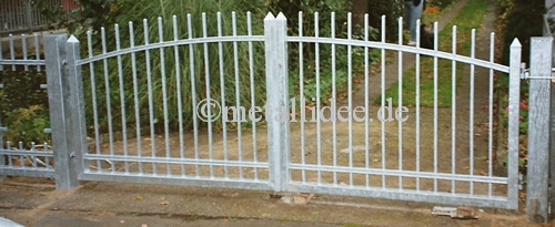 Lösung Metallidee #018: Toranalge 2-flg. aus verz. Stahl mit gebogenem Obergurt und überstehenden Stahlspitzen.