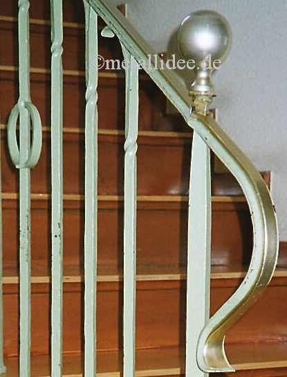 Geschmiedetes historisches Treppengeländer mit Stahlhandlauf und Aluschiene als Aufsatz. Geschmiedete