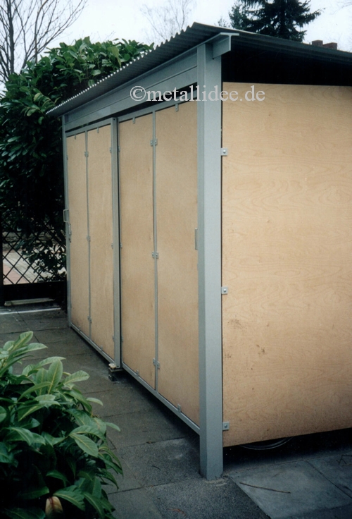Eine Fahrradschuppen aus einer Stahlkontruktion mit Schiebeelementen u. Wellblechdach. Freier Ablauf. Stahl verz. und grau gepulvert. Einsatz mit Multiplex-Holzfüllung Birke.