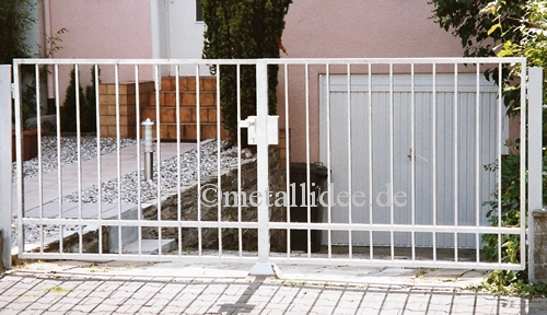 Ein leichtes 2-flg. Tor mit Vierkantrohrrahmen und Flachstäben als Füllung. Ausführung mit Feststellung.